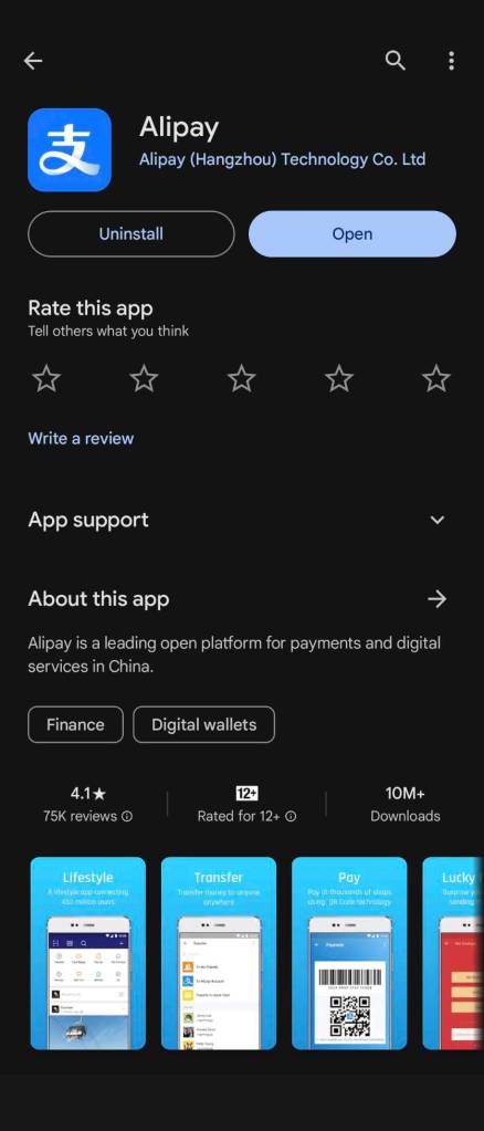 ก่อนอื่นต้องโหลดแอป Alipay ลงมือถือของเราก่อน โดยแอปของแท้จะต้องเป็นของบริษัท Alipay (Hangzhou) Technology Co. Ltd เท่านั้นนะครับ ระวังแอปเถื่อนของบริษัทอื่นด้วย แต่ในที่นี้ผมลงแอปในเครื่องแล้ว ปุ่มทางขวาจึงขึ้นเป็น Open แทนที่ปุ่ม Install ครับ