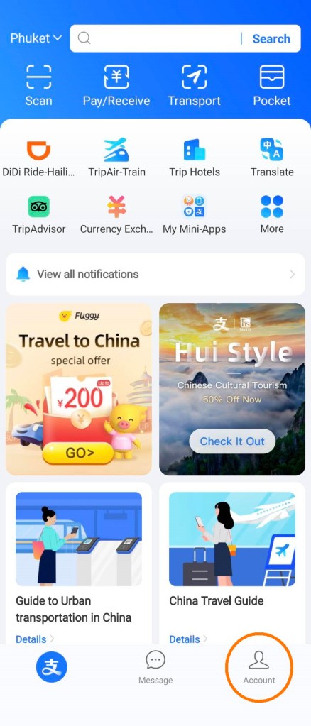 - Alipay เราสามารถโหลดแอป Alipay และลงทะเบียนเพื่อยืนยันตัวตนให้เรียบร้อย และผูกเข้ากับบัตรเครดิตในไทยก่อนเดินทางได้ สามารถใช้ซื้อของตามร้านค้าต่างๆ ได้ทุกร้านที่รับ Alipay (เว้นแต่รถไฟฟ้า ที่จะอธิบายในข้อถัดไป)
