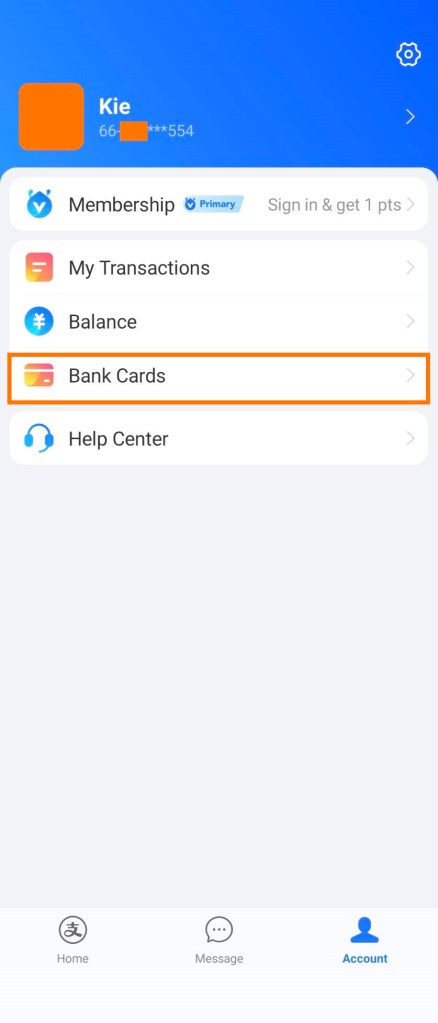 - ให้กดไปที่ Me หรือ My Account ตรงมุมขวาล่าง จากนั้นกดที่ Bank Cards