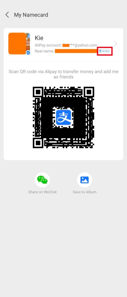 หากบัญชีเรายืนยันตัวตนสมบูรณ์แล้ว จะมีเครื่องหมาย Verified อยู่ต่อจากชื่อจริงของเรา ตามที่วงไว้สีแดงในภาพครับ เมื่อบัญชีเราได้รับการยืนยันตัวตนแล้ว ก็สามารถไปใช้จ่ายต่างๆ ในจีนได้แล้วครับ (ยกเว้นแต่ตั๋วรถไฟฟ้า ตามที่อธิบายไว้ก่อนหน้านี้)