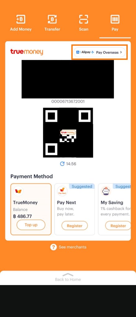 - จากนั้นข้างใต้คำว่า Pay ที่เรากดไปนั้น จะมีปุ่มที่เขียนว่า Pay Overseas พร้อมสัญลักษณ์ Alipay อยู่ด้วย ให้กดเข้าไปได้เลยครับ